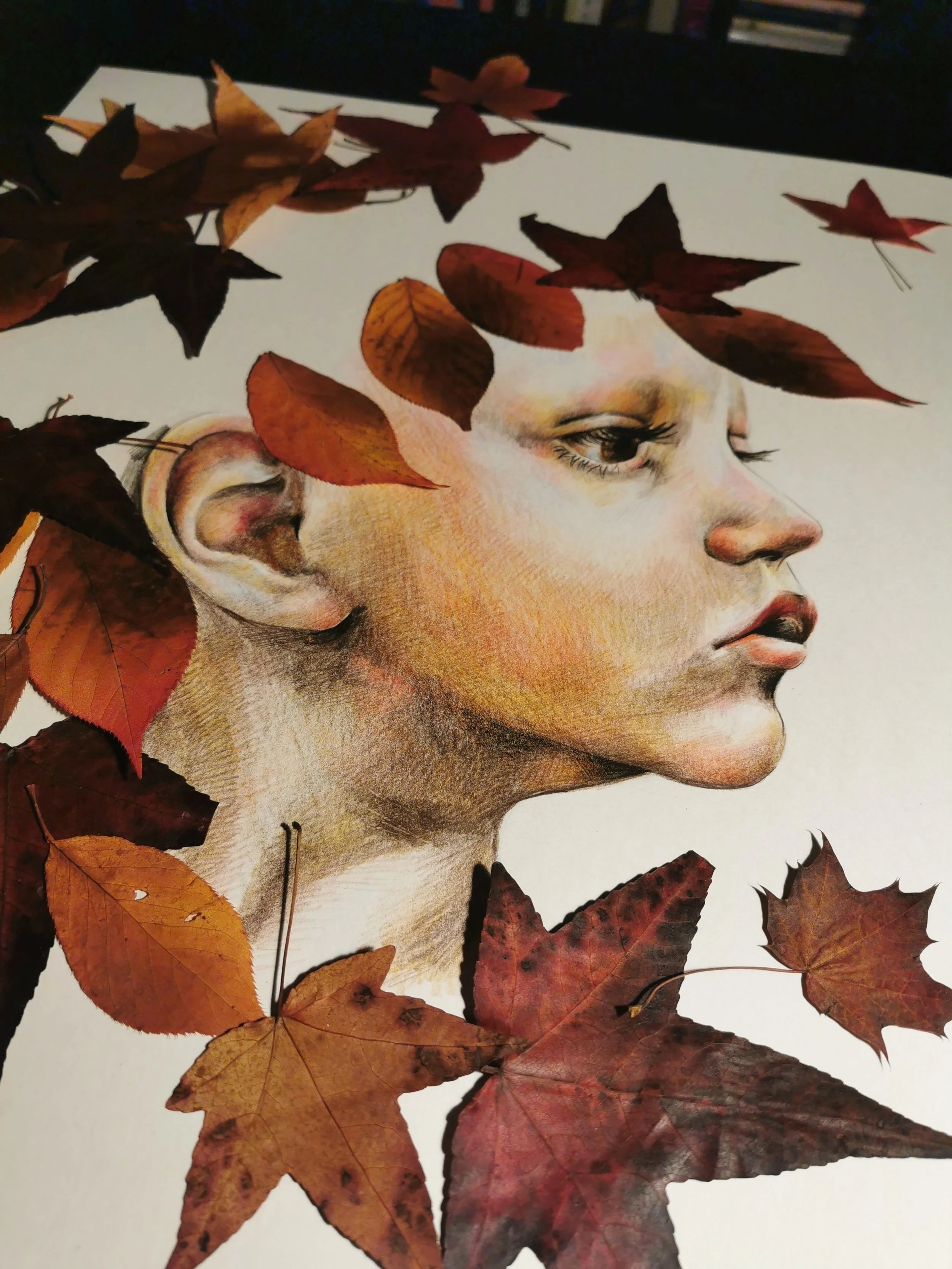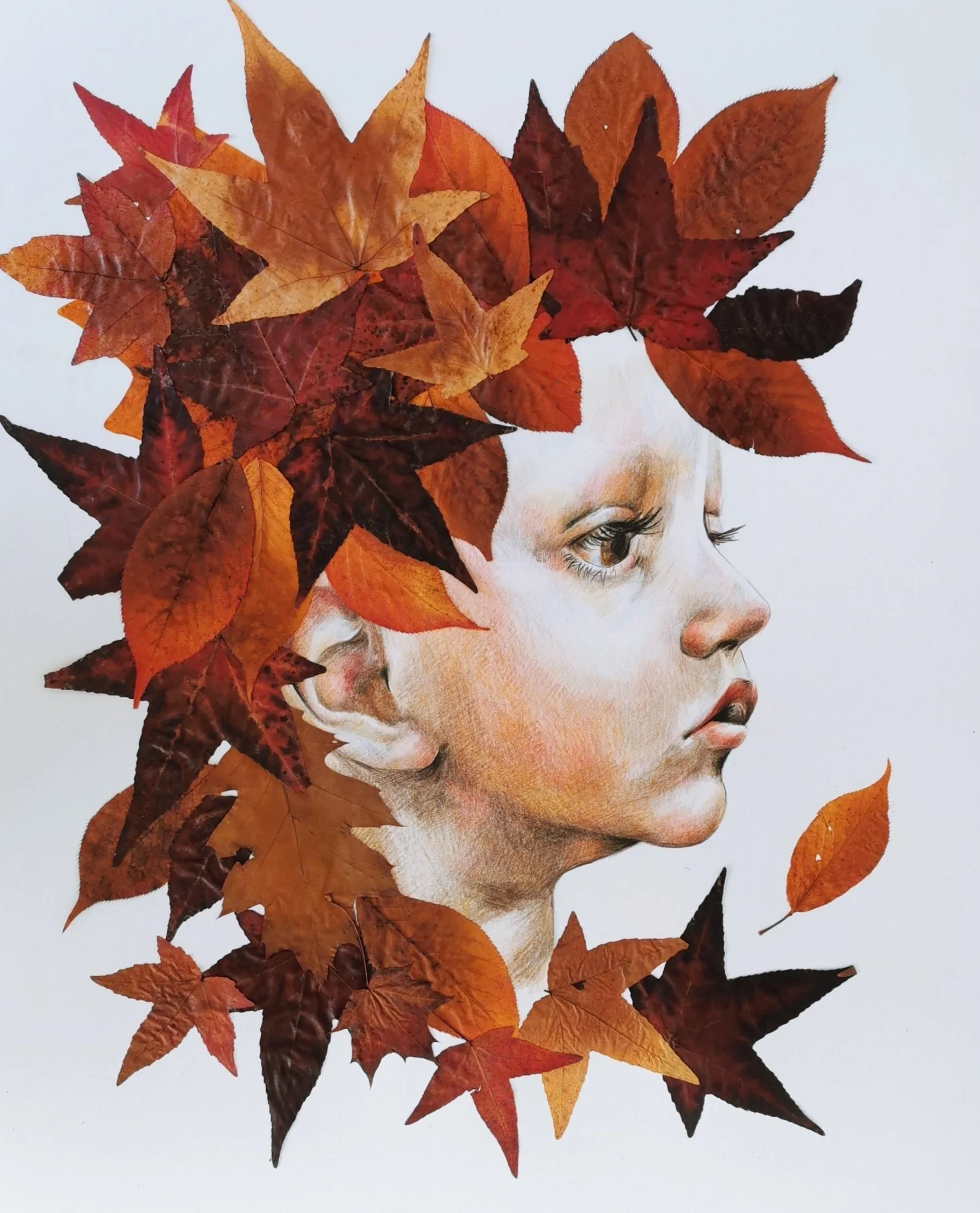Die in diesem Werk verwendete Blätter sind von mir selbst gesammelt und getrocknet. Das erinnert mich an meine Kindheit, Kastanien sammeln, Blätter pressen, Drachen steigen lassen und der Regen der beim Sonntagsspaziergang auf den Regenschirm tröpfelt.