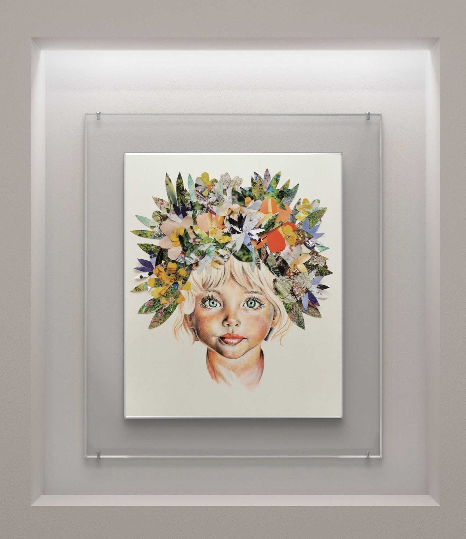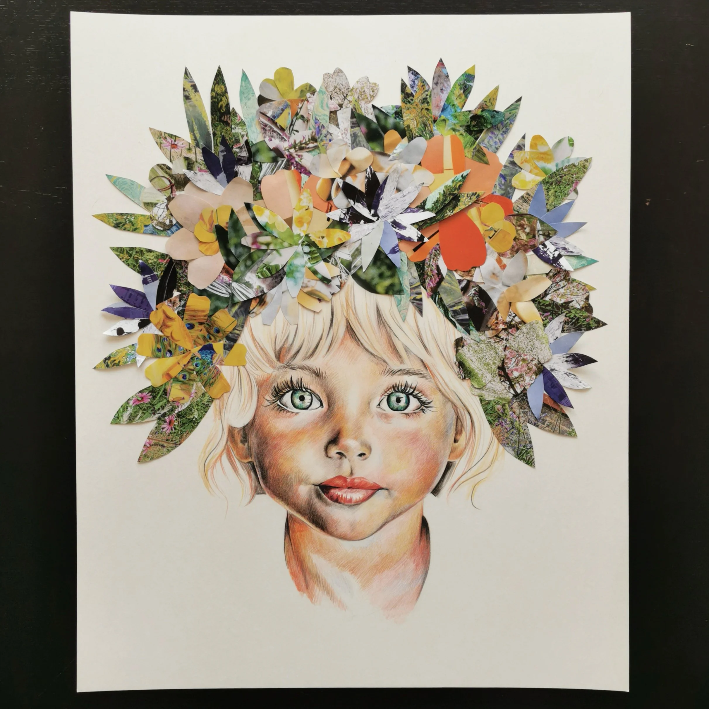 Mein Frühlingsmädchen trägt eine große bunte Blätterkrone, welche ich mit Collage angefertigt habe. Mit großen Augen zum Staunen bereit erwartet sie das erste warme Licht nach einem langen Winter.
